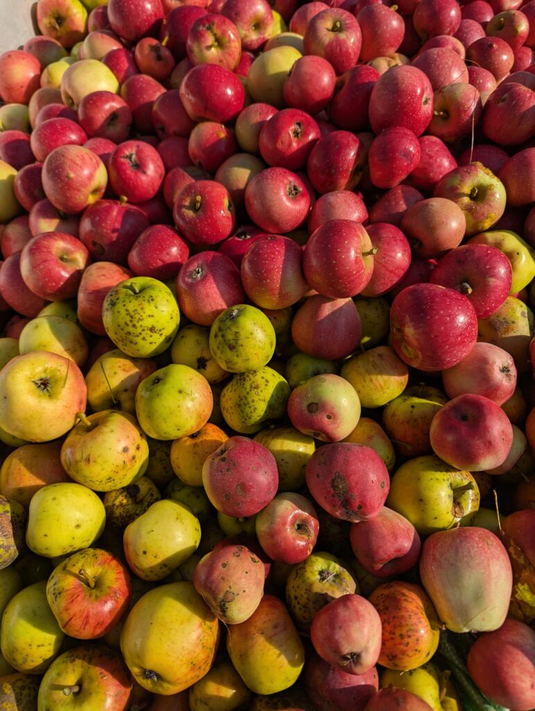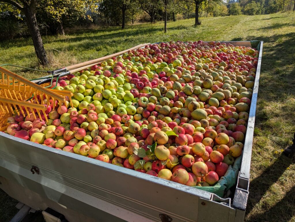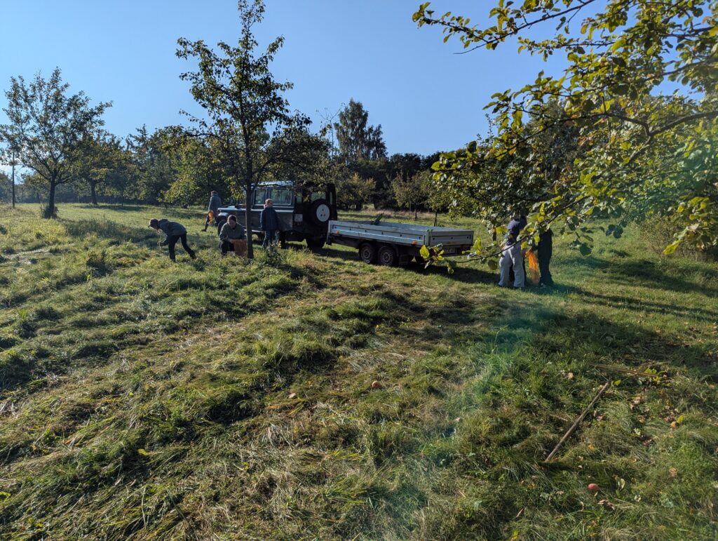 Bevor die EGE am Nachmittag des 2.10.25 ihre Türen zur Projektpräsentation öffnete, unterstützte eine Gruppe aus Lehrkräften und Schülern das Naturschutzzentrum in Dörfel bei einem Ernteeinsatz der Äpfel auf den Streuobstwiesen. Dabei wurden unzählige Äpfel gepflückt, geschüttelt und aufgesammelt, die zu einem leckeren Apfelsaft werden sollen. Wir lernten zahlreiche verschiedene Arten kennen und gekostet wurde natürlich auch. Ein herzliches Dankeschön an alle Helfer!