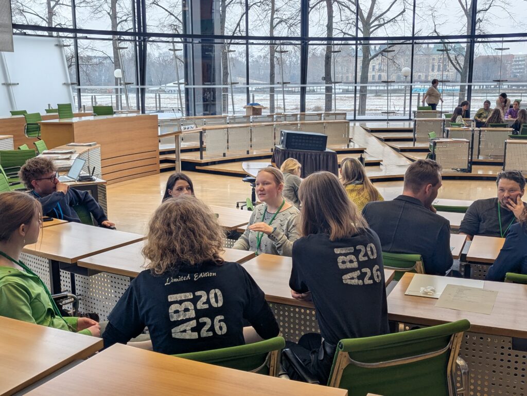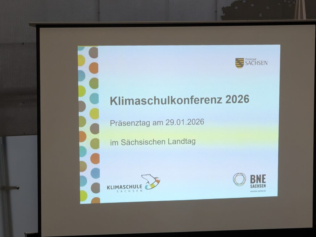 Auf der am 28.1 (Online-Tag) und 29.1.26 (Präsenztag in Dresden im Sächsischen Landtag) stattfindenden Klimaschulkonferenz, an der auch eine Gruppe unseres EGE-Klimaschulteams bestehenden aus Lehrkräften und Schülerinnen und Schülern teilnahm, wurden 17 neue Klimaschulen zertifiziert und sechs rezertifiziert. Insgesamt gibt es damit nunmehr über 60 Klimaschulen in Sachsen und die Politik, die durch den Staatsminister für Kultus, Conrad Clemens, und den Staatsminister für Wirtschaft, Arbeit, Energie und Klimaschutz, Dirk Panter, sowie weitere Mandatsträger gut vertreten war, sicherte ihre weitere Unterstützung der Klimaschulen zu und formulierte das Ziel im Jahr 2030 mindestens 100 Klimaschulen in Sachsen zu haben.