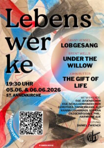 „Lebenswerke“ sind all unsere verschiedenen Lebenswege und -ziele, unsere Handlungen und Haltungen, unser Gelingen und Scheitern, die wir im großen Schöpfungswerk als unserem Lebensraum verantworten, genießen oder erleiden. Dabei kommen drei musikalische Werke über das Leben zu Gehör. Das Konzert schlägt zunächst einen Bogen von der Kantate „Lobgesang“ aus der Feder von Fanny Hensel (1805-1847), die sich auf die Geburt menschlichen Lebens bezieht, hin zur Vertonung des Gedichtes „Under the willow“ von Brent Wells (*1984), die in einem sanften Bild das dramatische Ereignis Kindstod in den Blick nimmt. Ins Zentrum der Werkreihe rückt dann aber John Rutters (*1945) „The gift of life“, das eindrücklich appelliert, das Leben als Geschenk anzunehmen und zu gestalten.