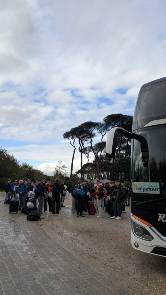 Den letzten Tag wollten wir eigentlich im Vatikan verbringen. Doch auch hier mussten wir zuerst einige Strapazen bewältigen. An der Bushaltestelle wurde Herr Bach einfach vom Busfahrer stehen gelassen – die Türen schnappten zu, als er gerade einsteigen wollte. Als wir ihn später am Petersplatz wiedertrafen, mussten wir feststellen, dass ein Teil unserer Gruppe in der falschen Schlange gestanden hatte. Aufgrund diverser Kommunikationsprobleme verließen sie in dem Moment den Platz wieder, als der Rest der Gruppe gerade die Sicherheitskontrollen passiert hatte. Am Ende ging dann aber trotzdem alles gut, und wir konnten den atemberaubenden Petersdom betreten – und das sogar durch die Heilige Pforte im Heiligen Jahr 2025.