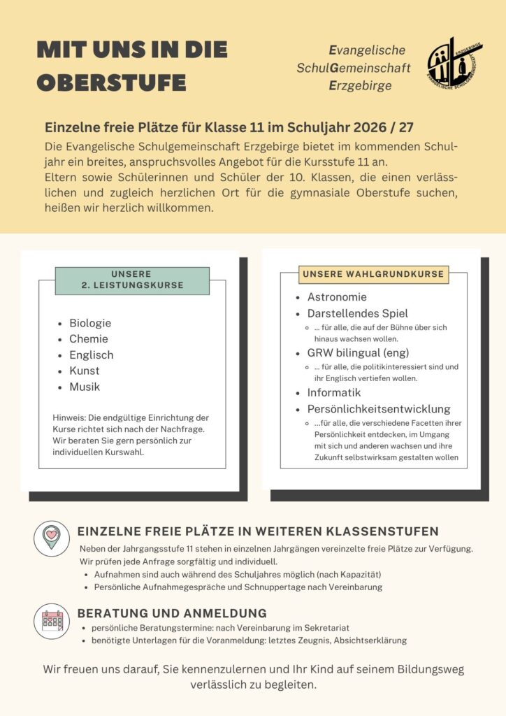 Wechsel zur EGE? Freie Plätze in zukünftiger Jahrgangsstufe 11 und weiteren Klassenstufen 23. März 2026 Manja Eschrich-Staudt Allgemein Link zur Vorlage Absichtserklärung