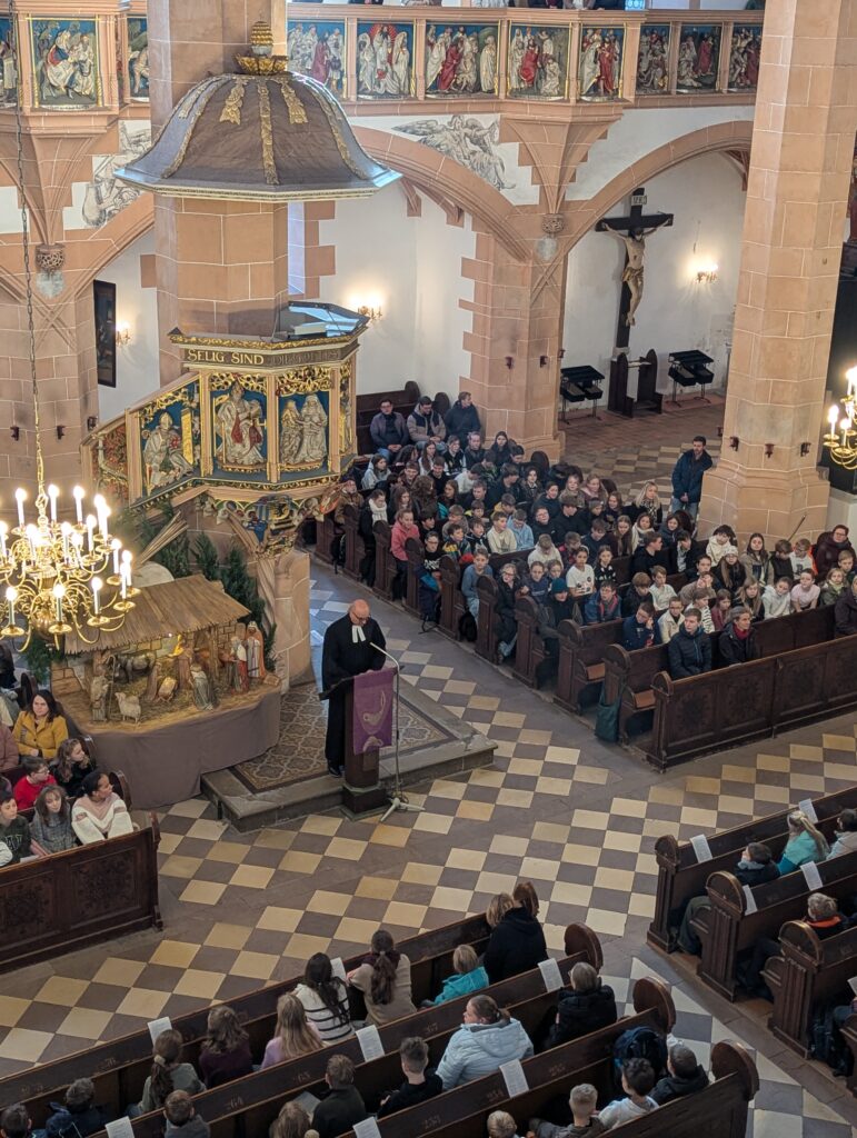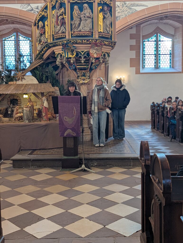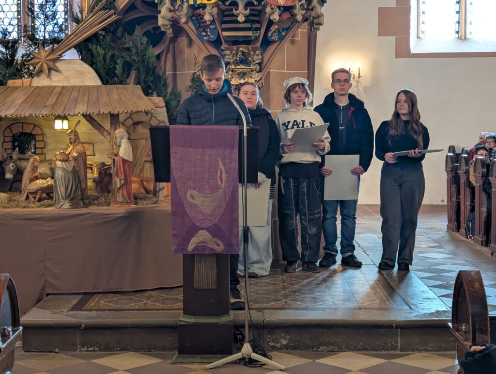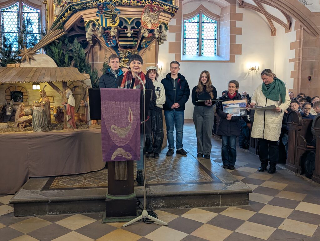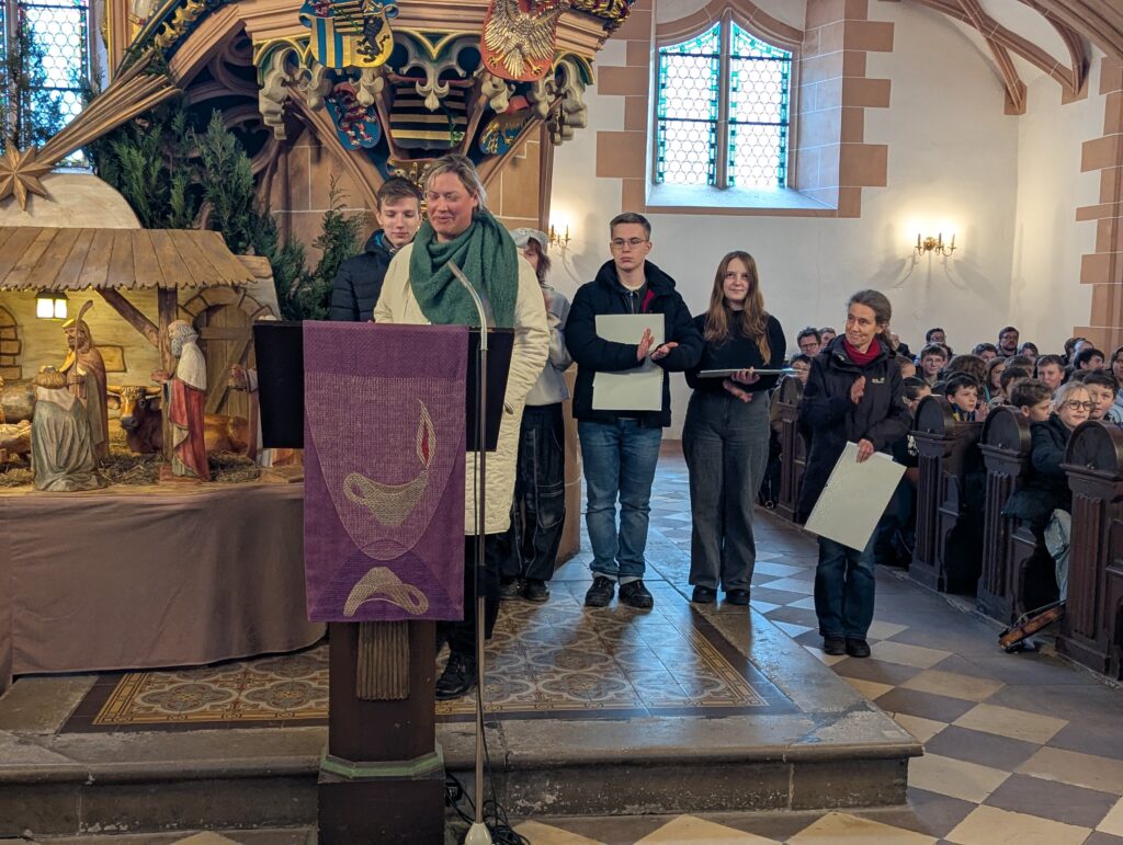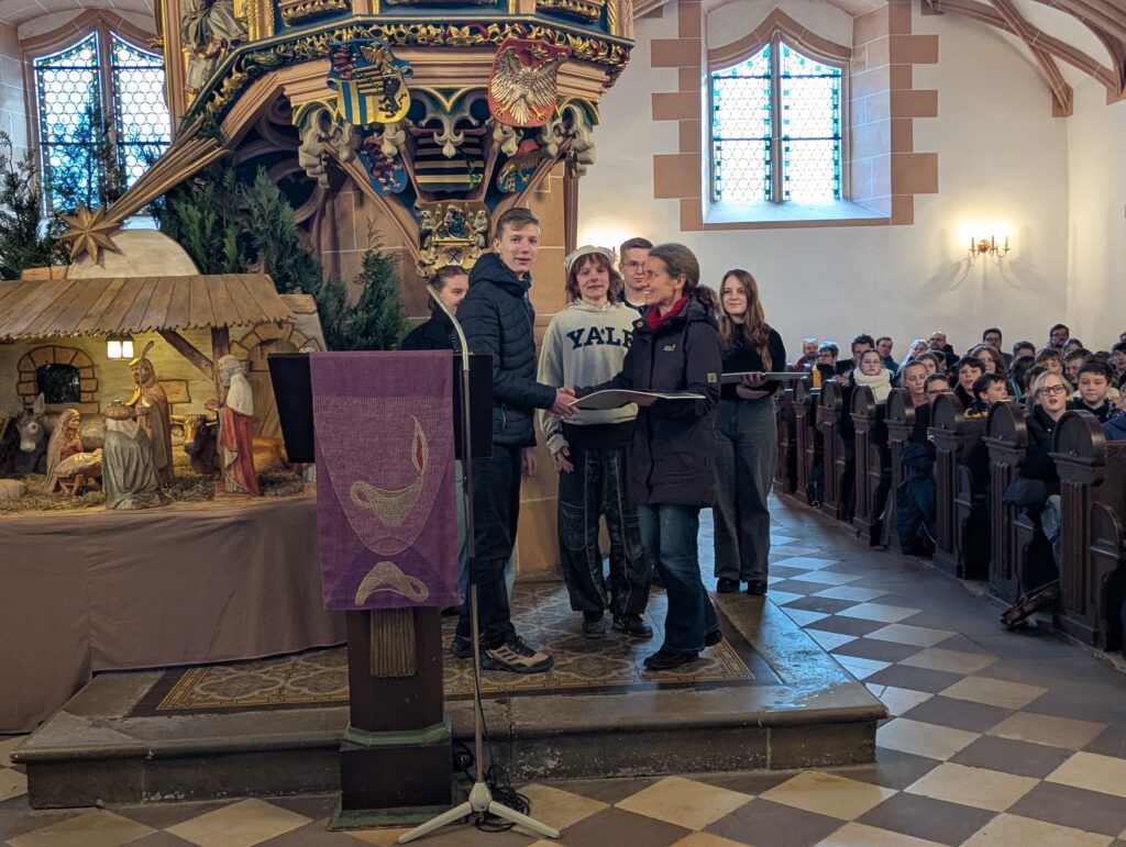 Im Rahmen des Gottesdienstes (Fotogalerie unten), der von Pfarrer Knittel und Schülerinnen und Schülern sowie Lehrkräften der EGE ausgestaltet wurde, wurde am 19.12.25  traditionell auch wieder ein Teil der Gelder, die im Juni 2025 im Rahmen des Sozialen Tages erarbeitet wurden, offiziell an die ausgewählten Spendenprojekte übergeben.