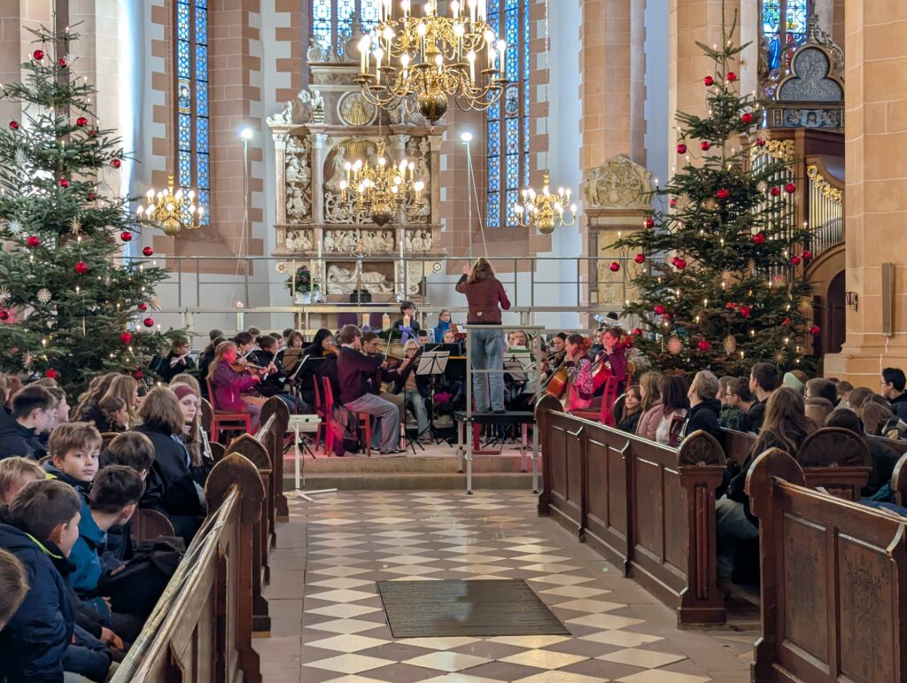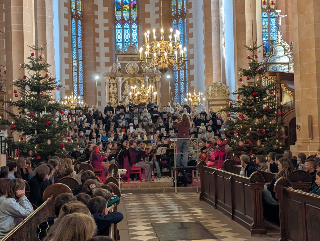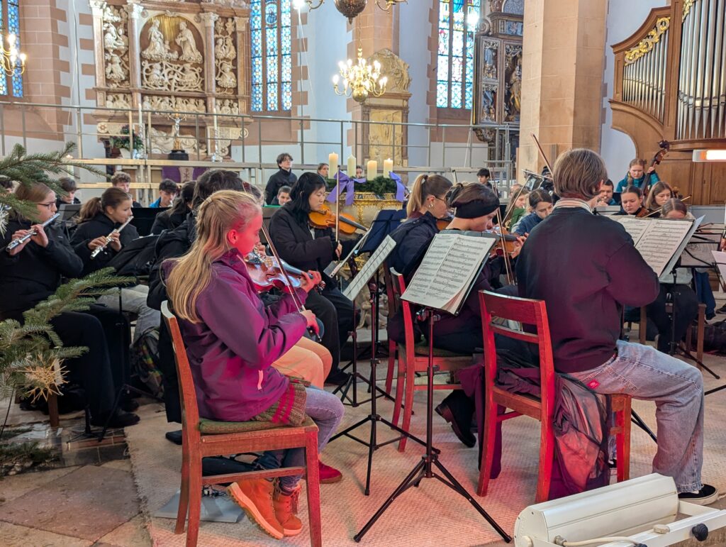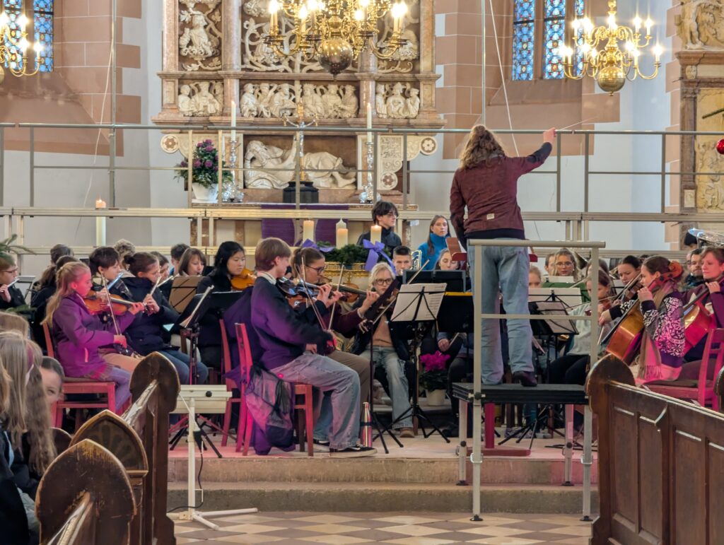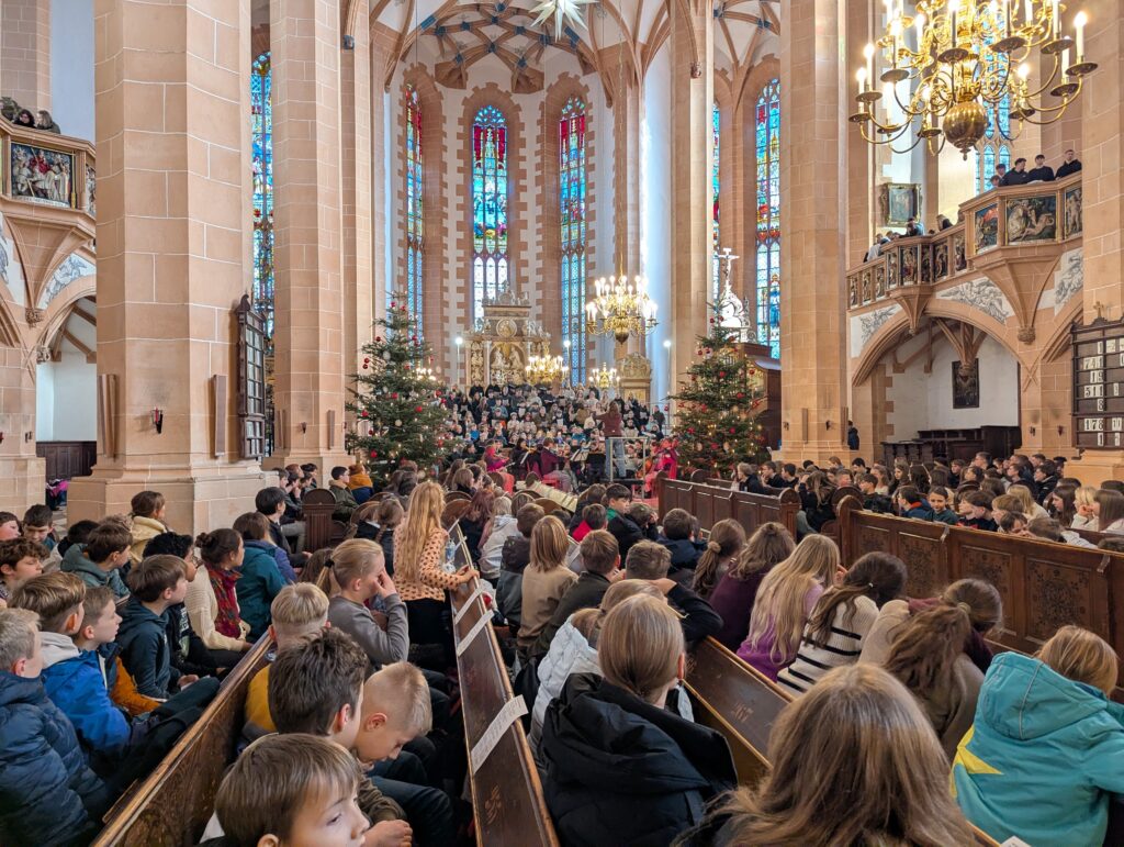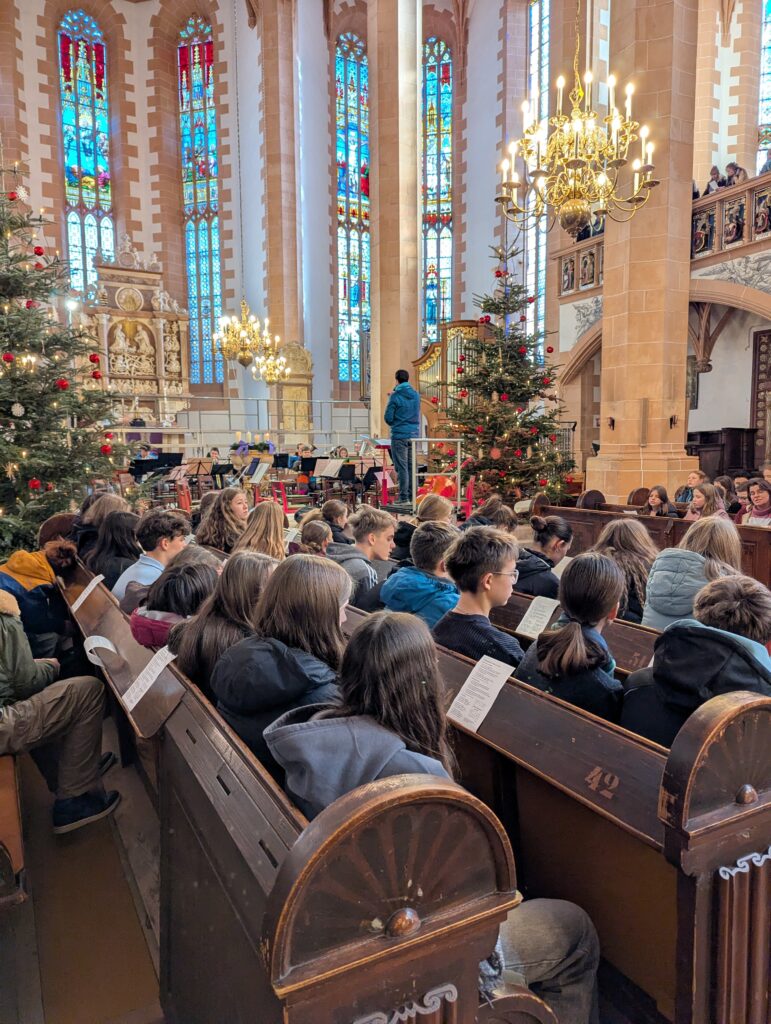 Im Rahmen des Gottesdienstes (Fotogalerie unten), der von Pfarrer Knittel und Schülerinnen und Schülern sowie Lehrkräften der EGE ausgestaltet wurde, wurde am 19.12.25  traditionell auch wieder ein Teil der Gelder, die im Juni 2025 im Rahmen des Sozialen Tages erarbeitet wurden, offiziell an die ausgewählten Spendenprojekte übergeben.