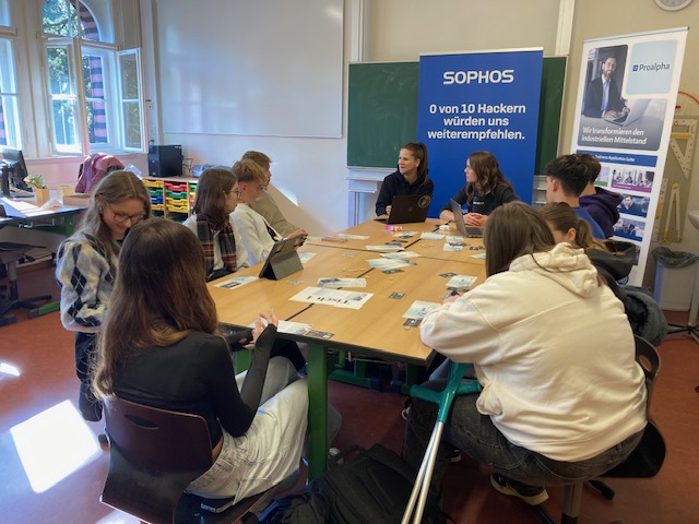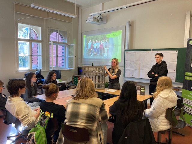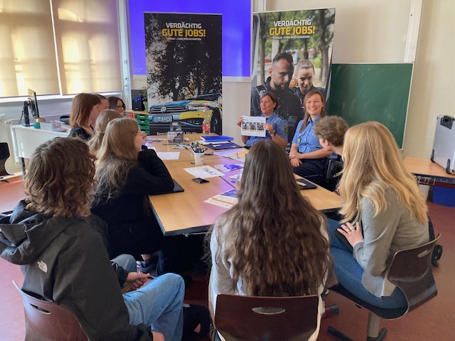 Zurück in der Räumen der EGE widmete sich der Jahrgang am letzten Tag der Projektwoche insbesondere den Möglichkeiten des Gap-Years nach der Schule. So lieferte Paul Lorenz, der im laufenden Schuljahr sein FSJ an unserer Schule absolviert, Einblicke in seinen Arbeitsalltag und die Rahmenbedingungen, die ein Freiwilligendienst mit sich bringt. Einen Blick ein ganzes Stück weiter über den Tellerrand hinaus vermittelte der Erfahrungsbericht von Almut Röder über ihre Zeit im Ausland und die Vorbereitungen und Voraussetzungen, die dafür getroffen werden müssen. Helene Schröer berichtete von ihrer Arbeit im Polizeidienst und abwechslungsreichen und sicherlich sehr einprägsamen Momenten in diesem Berufsfeld. Abgerundet wurde die Woche der Berufs- und Studienorientierung durch ein Speeddating mit sieben Unternehmen der Region, die den SuS gruppenweise in Zeitfenstern von jeweils 15 Minuten den Betriebsalltag und die Ausbildungs- und Studienmöglichkeiten vor Ort näherbrachten.